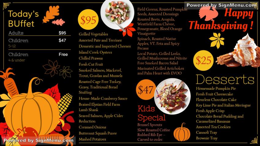 A truly classy Thanksgiving Day menu ! The yellow typeface and graphics are brilliantly contrasted with the black background color giving this board a classy and vintage feel. The menu too is well programmed with a kids section along with the adultâs and at different price points. On a digital screen this template will truly connect with the target audience. The restaurant will attract upmarket customers as well.