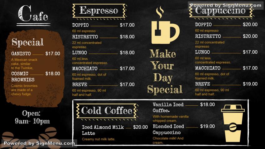 this template is best showcased on a digital signage screen atop the restaurant premises as well as indoors. This template will attract target audiences of all ages and from all walks of life. digital software today enables the restaurateur to update menu content from anywhere, anytime. this template provides a benchmark for your cafe menu and is ready for download and use.