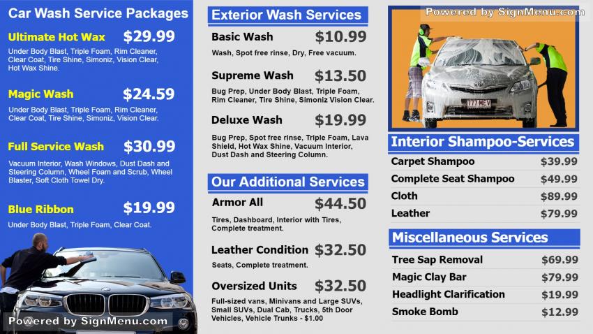 This template of a car wash garage is best presented on a digital signage menu board and is placed at the entrance of the garage as well as indoors. Car wash is a specialized service and garages which offer this complete spectrum of these services usually thrive on goodwill & get loyal customers. Hence, a digital signage menu will not only advertise the unique menu, but will also highlight the garage's name / logo for brand recall and retention by potential customers. This template is ready for download and use.
