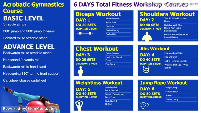 This template is best displayed atop the gym or just in front of the premises on a digital screen. The gym business usually grow their business through word of mouth advertising. But of late, most of the fitness centers are adapting to digital signage to attract more customers and increase their business. This template provides a bench mark for advertising for a short course in physical training with different modules. It is ready for download and use.