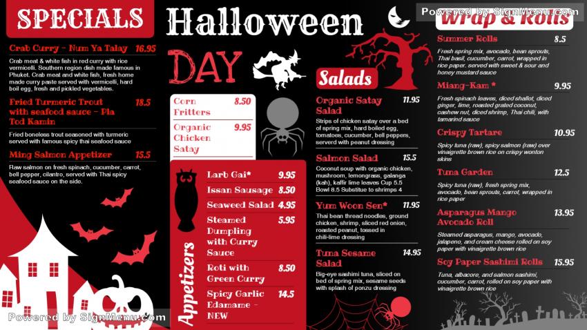 Another very vibrant Halloween menu board. The colors of black, white and red are brilliantly matched to provide the menu board an elegance along with the mood and flavor of Halloween. The menu is rightly multi-cuisine with focus on Indian varieties and American wraps and rolls. On a digital platform, this menu board will have a scintillating impact and the target audience will certainly come in.