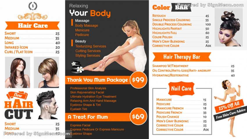 Our beautifully-designed salon board templates come with hundreds of customizable features. Every menuboard template is just a starting point — you can style it to look any way you want.