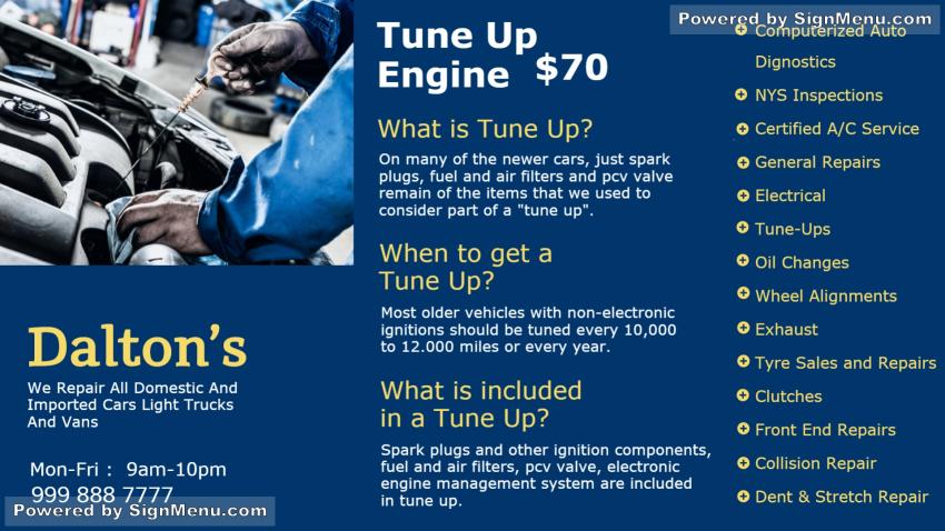 Our beautifully-designed car service board templates come with hundreds of customizable features. Every menuboard template is just a starting point — you can style it to look any way you want.