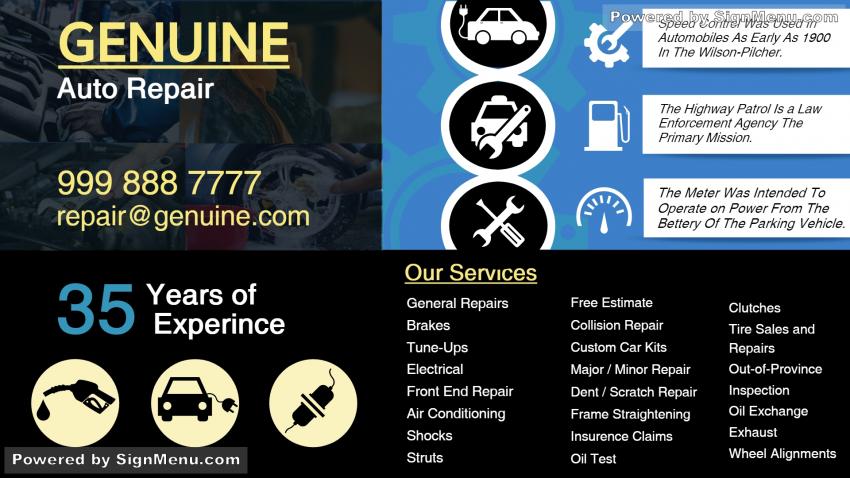 This template of an automobile garage showcases its entire spectrum of repair services. This is best showcased atop the garage premises or just in front of the garage entrance for maximum viewing of the target audience . The car repair garage business usually thrive by the word-of -mouth publicity of the satisfied clients. Hence, if this display is done on a digital screen, your target audience - the motorists- will certainly notice your company's brand/logo and look in to check out your services. Further, software technology has enabled updating of content at anytime, and from anywhere. This template is ready for download and use.
