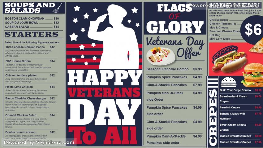 This Veteran’s Day menu board has it all ! The colors of the American flag with a soldier’s salute lending the mood , with the light beige color background with dark beige typeface providing the elegance. The multi-color graphics adds to the fun and flavor. On a digital screen, this menu board is a steal ! Sales should leapfrog quickly and the restaurant may have to hire additional staff to handle the deluge of customers !